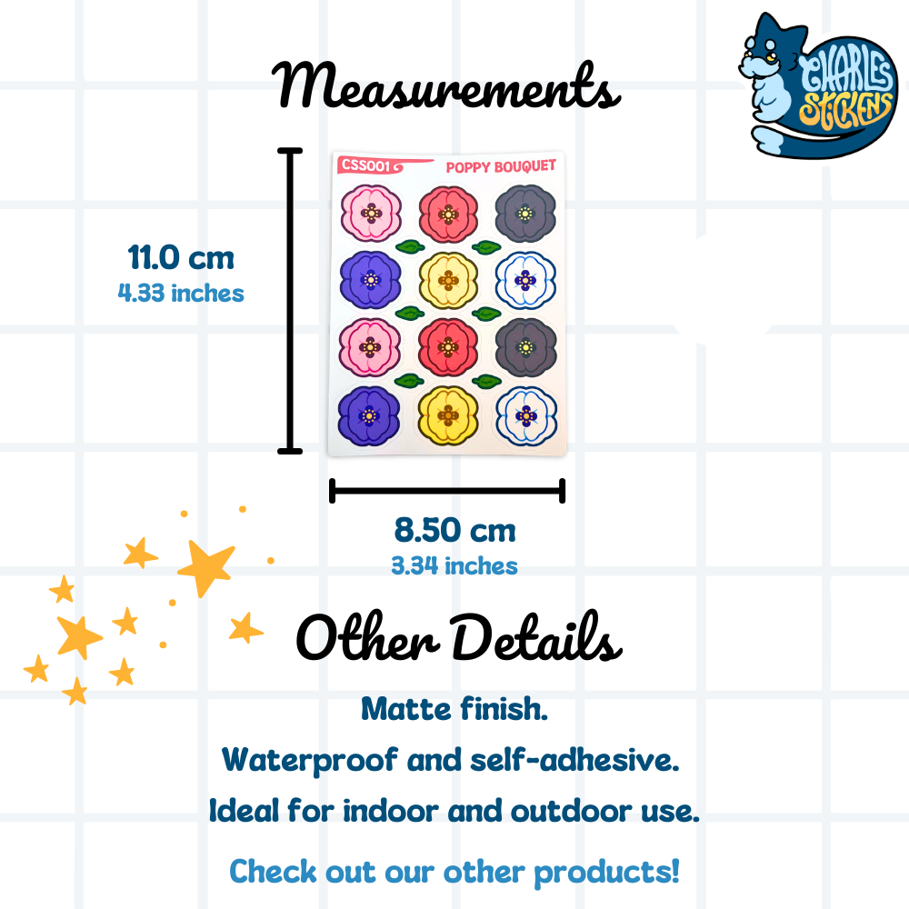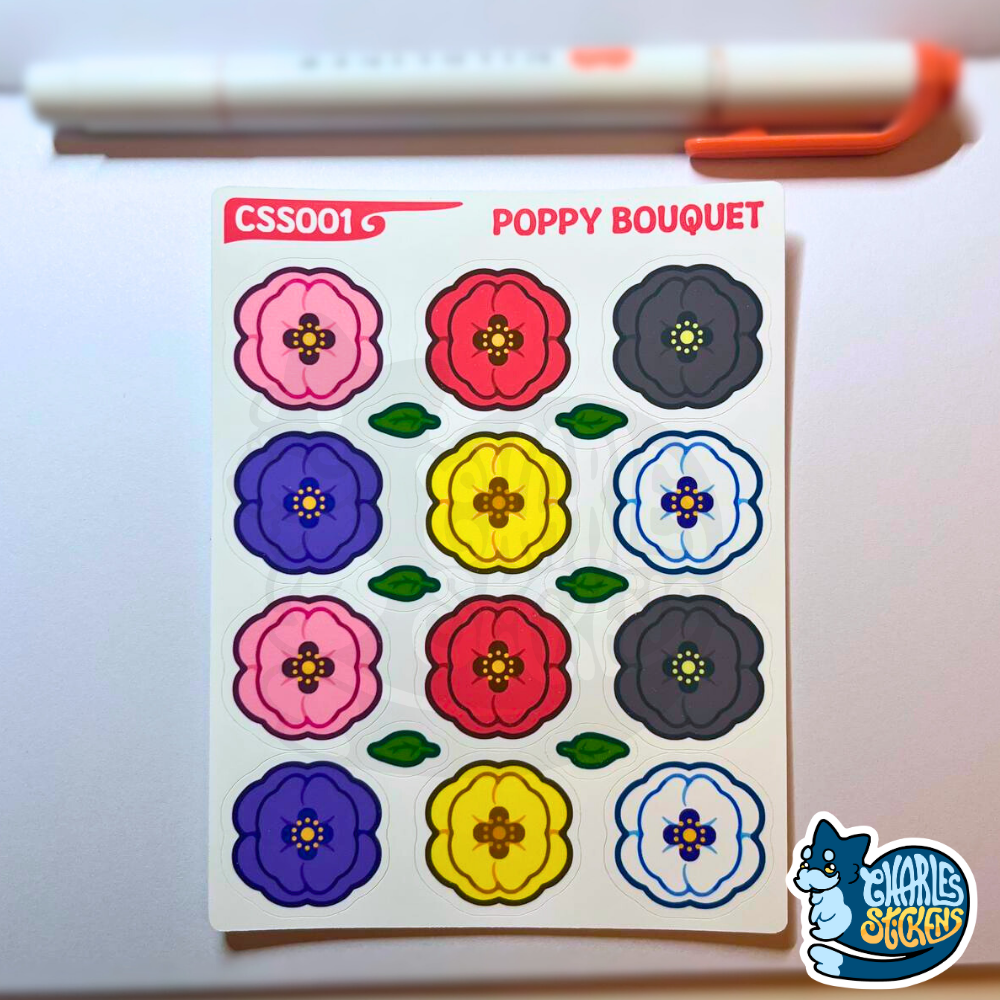 Esta folha de autocolantes inclui um par de papoilas cor-de-rosa, vermelhas, pretas, roxas, amarelas e brancas. Além disso, contém ainda seis folhinhas para adornares as tuas composições.